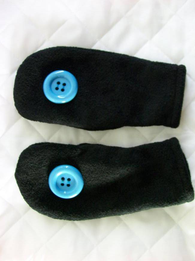 Mustat lapaset isoilla turkooseilla napeilla.