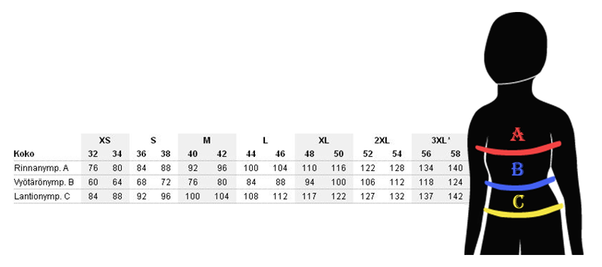 Tarkasta haluamasi koon mitat allaolevasta taulukosta. Mikäli koot eivät näytä sopivilta mittatilaustöistä, voit tiedustella sähköpostitse osoitteesta harajuku@harajuku.fi.