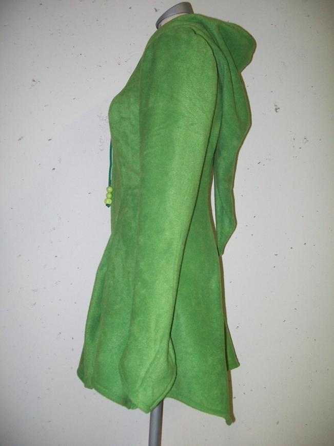 Vaaleanvihreä takki hiippahupulla.