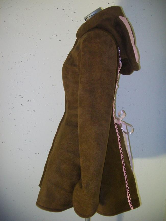 Fleecetakki. Edessä vetoketju. Takana pitsiin pujotettu satiininauha. Leveä helma.