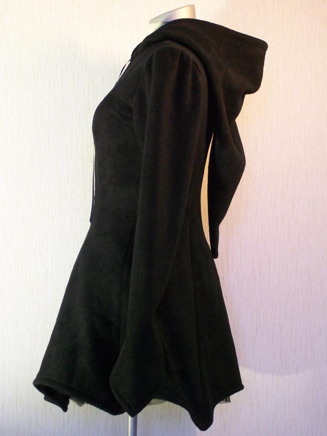 Musta takki hiippahupulla ja kaarevalla helmalla.
