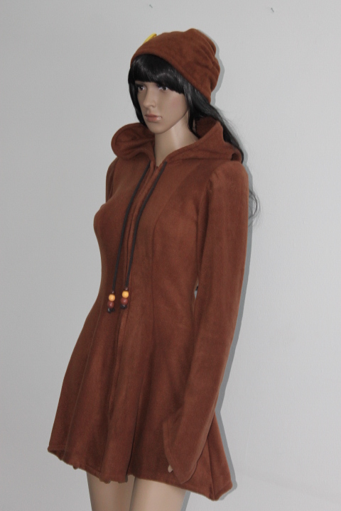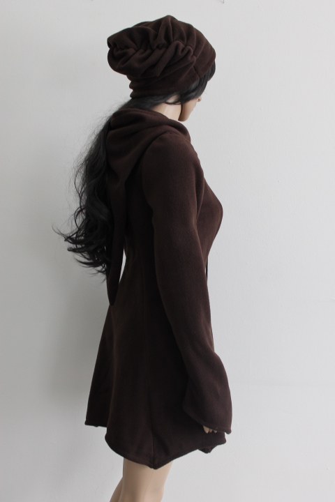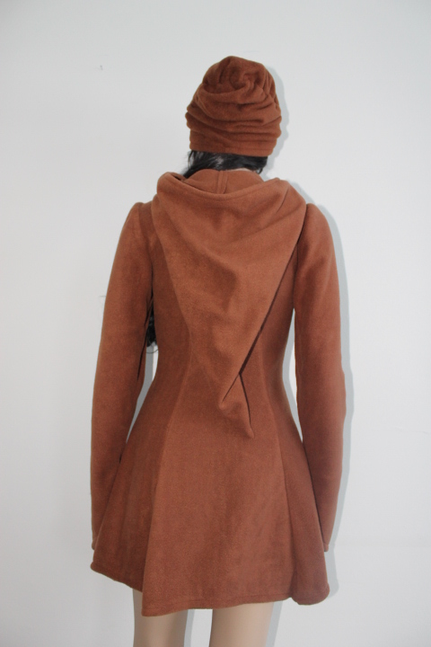 Ruskea takki hiippahupulla ja kaarevalla helmalla.