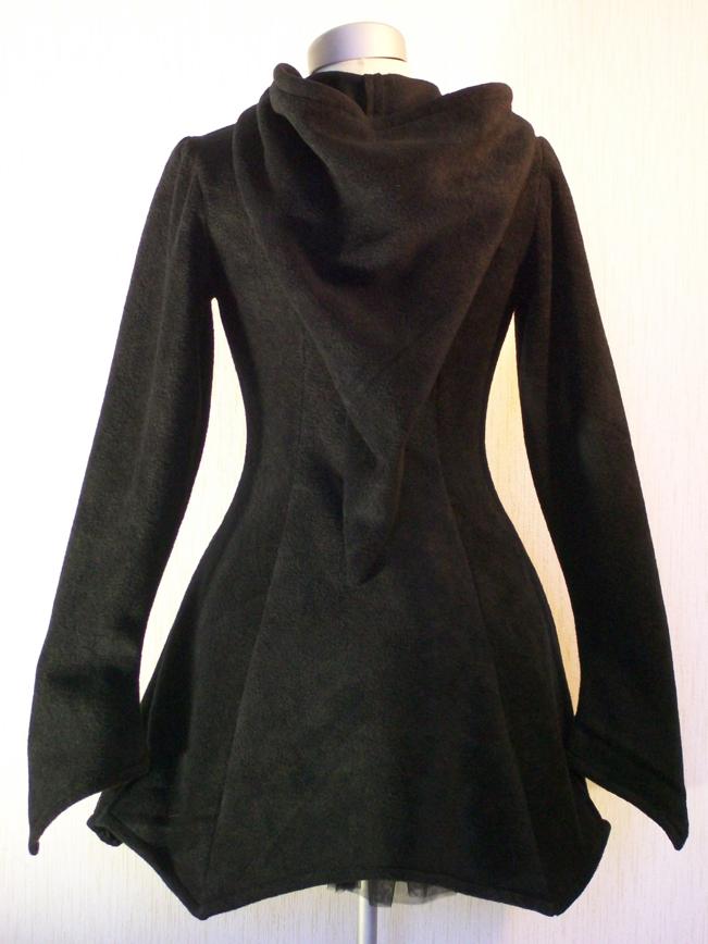Musta takki hiippahupulla ja kaarevalla helmalla.